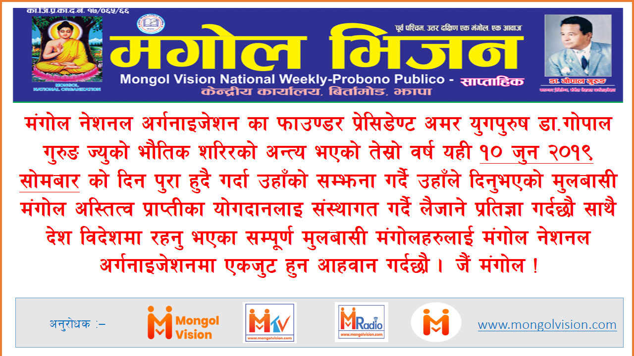 • <<<<मंगाेल भिजन साप्ताहिक पत्रिकाकाे इ. पत्रिका अब www.mongolvision.com मा अनलाइन पढ्न सकिनेछ>>>>